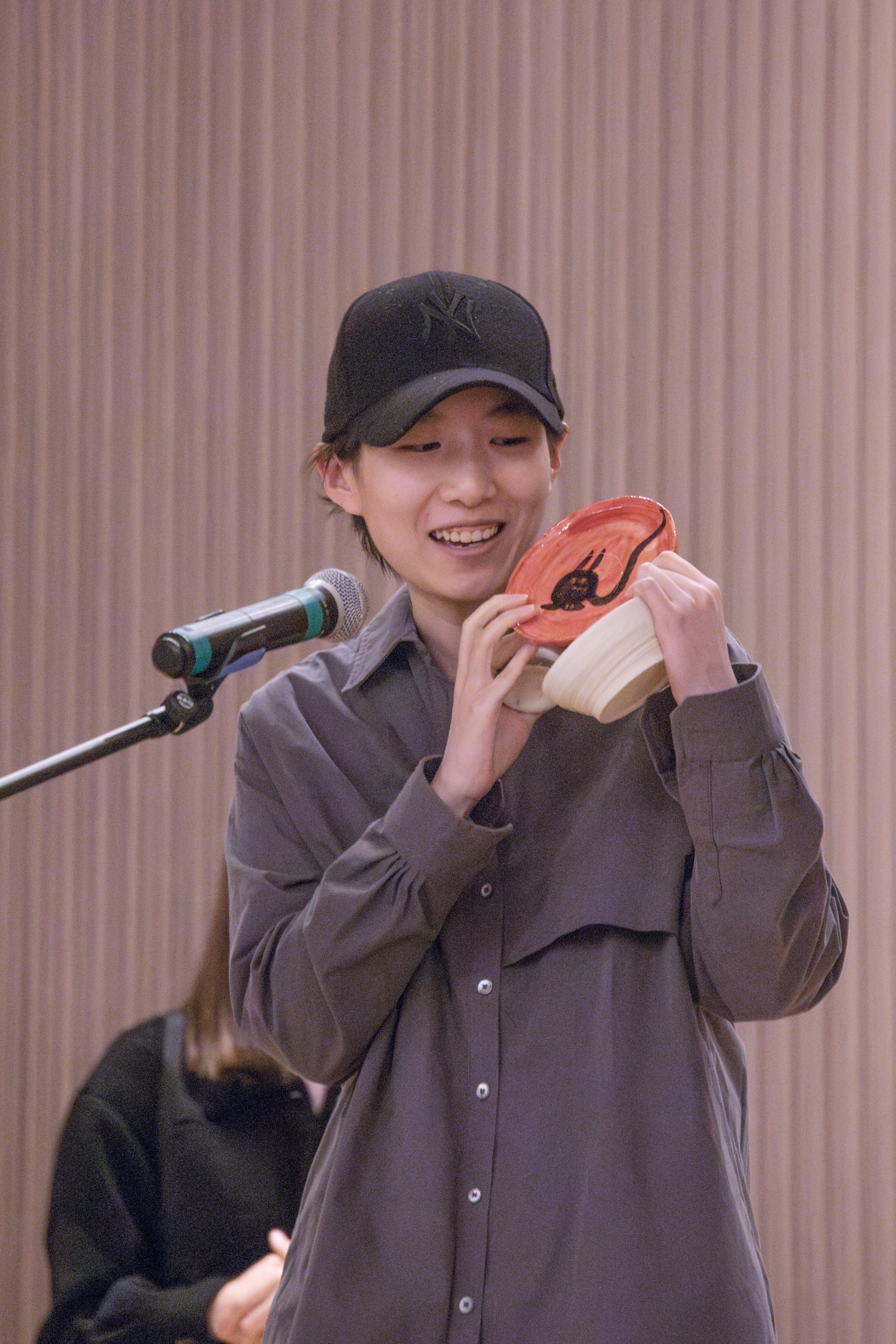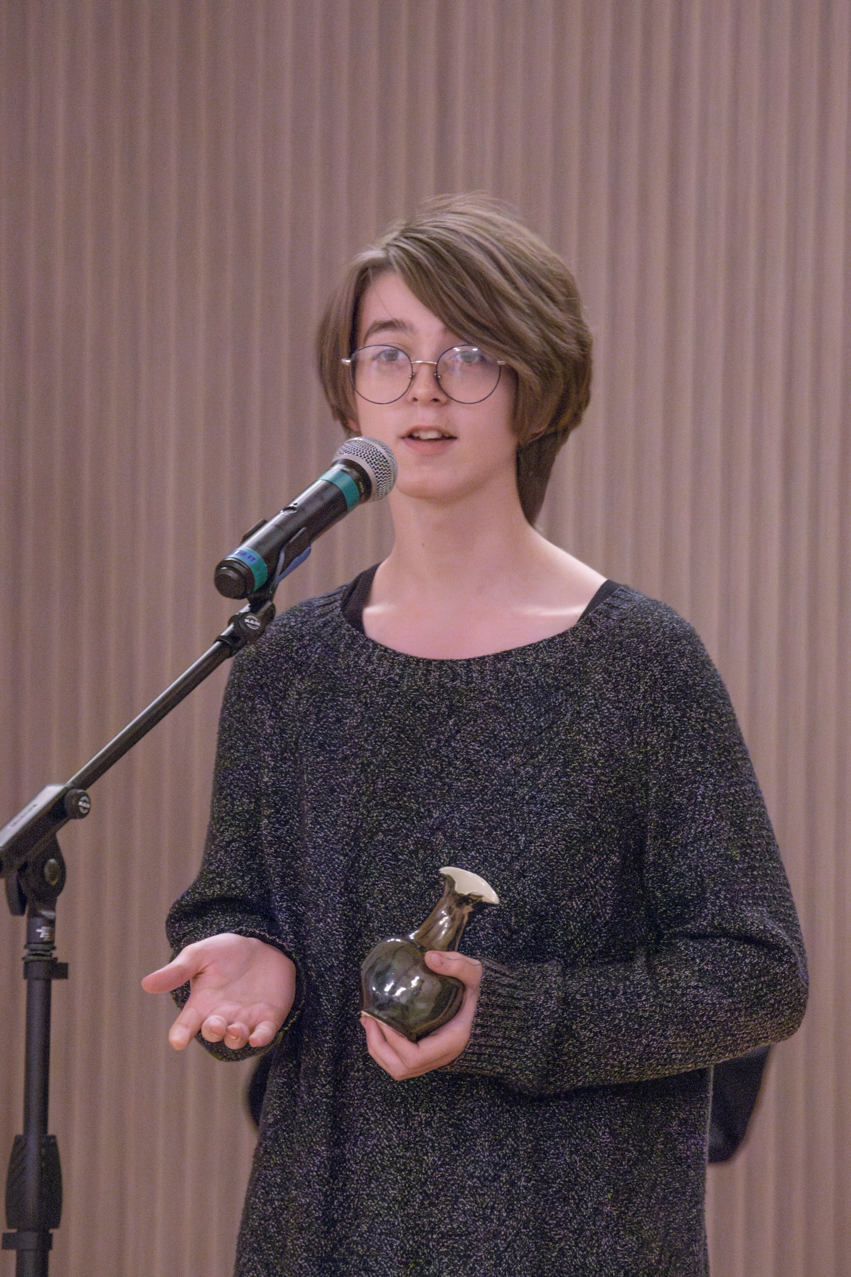A student of Pottery Fundamentals showing a piece.